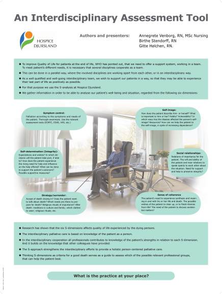 Aktiv palliativ indsats på Hospice Djursland indebærer at være på forkant, parat og opsøgende. Med respekt for patientens livsstil og normer tager det tværfaglige netværk afsæt i patientens subjektive opfattelse og oplevelse af kvalitet i livet – synliggjort via patientens samlede S-status.